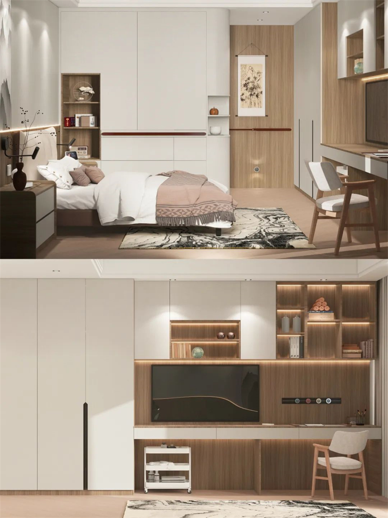 ??床尾選擇做衣柜+書桌柜一體化設計,看書、練書法、看電視,在家悠閑樂享時光?