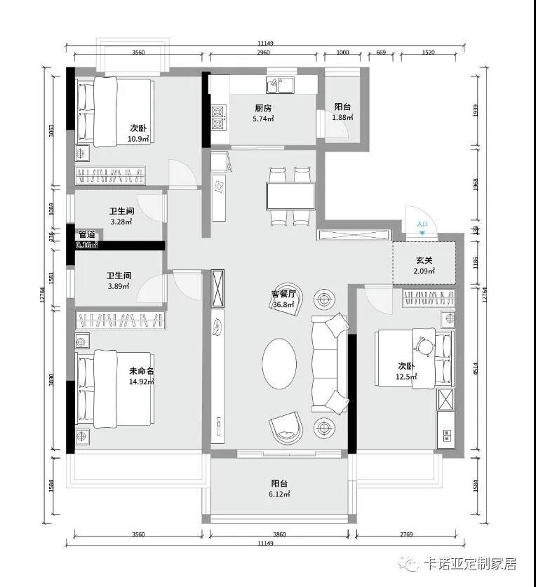 清洗區(qū)和烹飪區(qū)分別位于轉(zhuǎn)角兩側(cè)