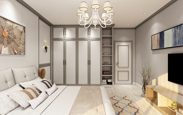 簡歐風格特有的方正造型灰色邊框的木門,一改木門平面單一的視覺印象,同時與到頂衣柜、護墻板在紋理及材質上相呼應,整體空間寧靜素雅,溫暖直抵人心。