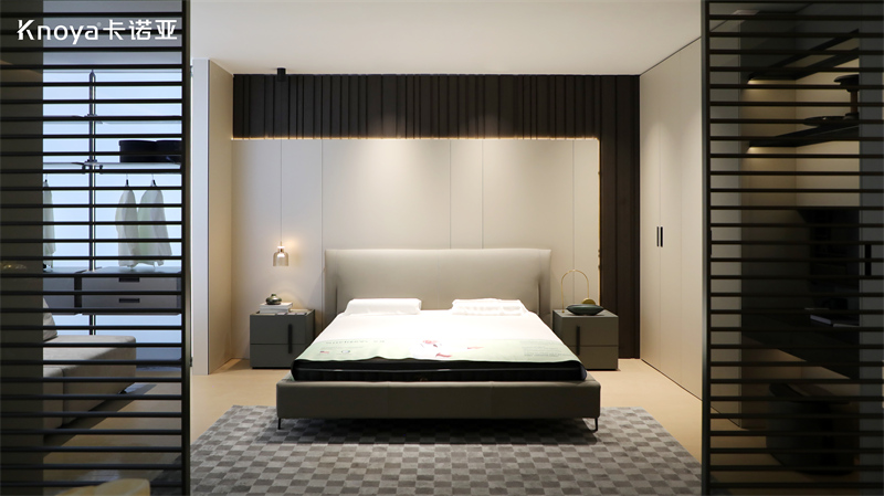 臥室空間,采用卡諾亞新品極簡風(fēng)格覽境系列,以柜墻門一體化設(shè)計(jì)搭配更多功能系統(tǒng),打造符合生活偏好與美學(xué)的“臥室系統(tǒng)”,汲取臥室系統(tǒng)“閑忙享樂學(xué)”生活方式靈感。