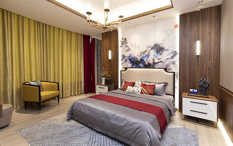 卡諾亞丨東方雅閣·臥房采用隔斷柜隔開主臥和衣帽間功能區,相對獨立、互不干擾,一邊是全身試衣鏡,一邊是梳妝臺,中式屏風點綴,讓隔斷柜成為臥房一道靚麗的風景線。歐式墻裙、中式臥榻、床頭3D中式山水裝飾畫、皇家黃與中國紅搭配的窗簾、對稱均衡的設計,讓臥房別具東方人文氣質。